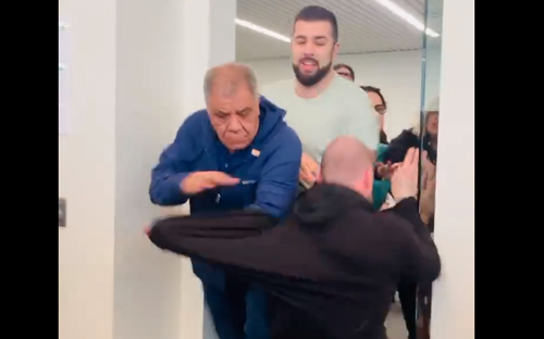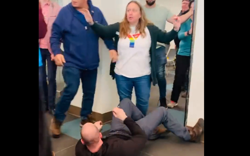 A video posted online shows what happened next: After refusing to leave, Reimer was literally tossed out the door (pictured below) by two men who were attending.