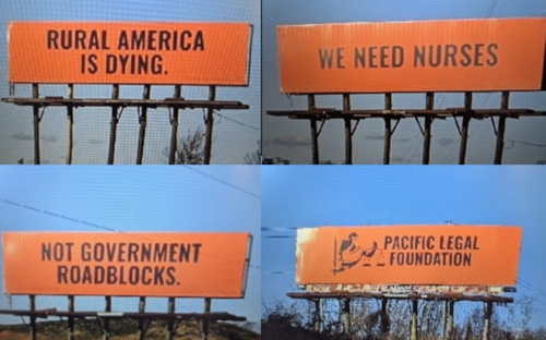 Pacific Legal Foundation is using billboards in The Tar Heel State, along I-77 near Statesville, that state “Rural America is Dying” and “We Need Nurses.”